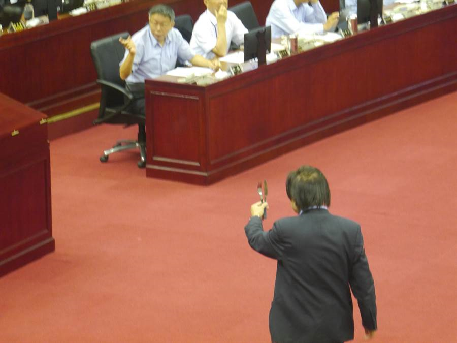 台北市議員王世堅今(11日)在台北市議會上,拿出刀叉送給柯文哲,叫柯別再用刀叉吃人肉。(圖片來源:台灣“中時電子報”)