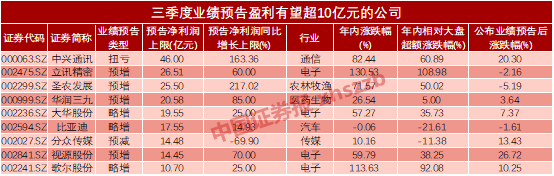 從盈利規模來看,106家公司今年前三季度盈利有望過億元,其中9家公司有望超過10億元。中興通訊淨利潤預期最高,達46億元,業績預告公佈至今公司股價已上漲超20%。位居次席的立訊精密淨利潤最高有望達到26.51億元。除立訊精密外,盈利居前的公司中還可以看到多家電子企業的身影。大華股份、視源股份、歌爾股份預告淨利潤上限分別達到19.55億元、14.45億元和10.7億元。
