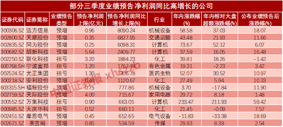 從業績增速來看,96家公司淨利潤同比有望翻番,其中8家公司更是預計增長超十倍。遠方信息預計淨利潤增長超80倍居首。遠方信息是一家智能檢測識別信息技術和服務提供商,公司預計2019年前三季度實現淨利潤9600~9635萬元,同比增長8060.49~8090.24%。儘管公告中提到業績補償尚未註銷的股份受股票二級市場價格影響,上述淨利潤預測存在較大不確定性,二級市場仍對此反應積極,預告公佈後股價累計上漲18.07%,年內相對大盤超額漲幅高達37.03%。
