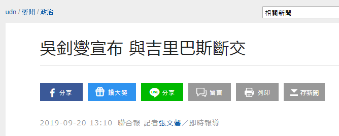 此前,台灣“東森新聞雲”《聯合報》等媒體報道,基里巴斯20日與台當局“斷交”,確定成為蔡英文2016年上任至今,與台“斷交”的第7個“邦交國”,台外事部門將於下午1點召開記者會説明。