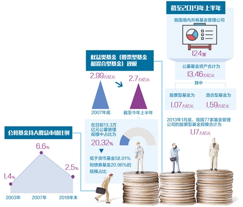 中國證券投資基金業協會統計顯示,截至2019年6月底,我國境內共有基金管理公司124家,公募基金資產合計為13.46萬億元。其中,股票型基金為1.07萬億元,混合型基金為1.59萬億元。2013年1月底,我國77家基金管理公司的股票型基金規模合計為1.17萬億元。