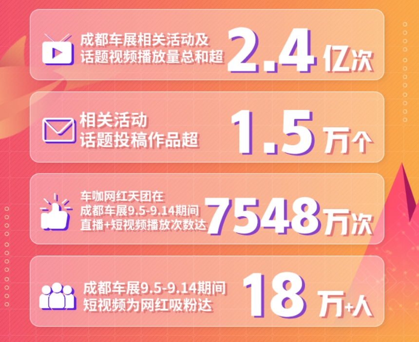 快手新穎的逛車展模式吸引了諸多老鐵互動的激情。來自快手的官方數據顯示,車展期間,快手平台上#成都車展#相關話題投稿作品已超1.5萬個,相關活動及話題視頻播放量超過2.4億;截至9月15日,車咖網紅天團在成都車展期間的直播+短視頻播放次數達7548萬次,車展期間短視頻為網紅吸粉超18萬人。與之形成對比的是,今年成都車展人流量為72.5萬人。
