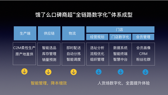餓了麼口碑將從會員、支付、營銷、倉儲、即時物流、供應鏈六大方面輸出數字化能力,並將“全鏈路數字化體系”複製到商超領域。如今,許多商超品牌開始向柔性生產發力,根據消費需求進行選品、備貨。餓了麼口碑推出的一系列數據產品,將對整個供應鏈進行智能管理,打通線上線下庫存,實現銷量預測,甚至根據用户畫像進行智能選品。