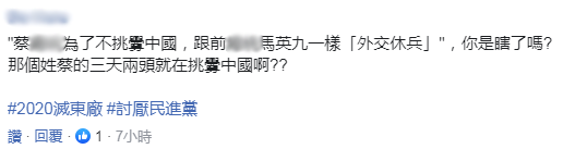 還有網友則對陳水扁聲稱蔡英文“不挑釁”大陸,跟馬英九一樣“外交休兵”不滿表示,“你是瞎了嗎?那個姓蔡的三天兩頭就在挑釁中國(大陸)啊”↓