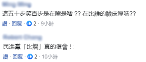對於陳水扁的言論,有台灣網友諷刺,這五十步笑百步,是在比誰的臉皮厚嗎?民進黨真的很會比爛。↓