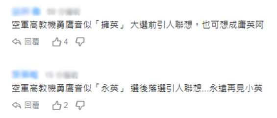 至於“勇鷹”這個名字的含義,島內網友卻也有不同理解:可以想成是“庸英”;音似“永英”,“永遠再見小英”↓