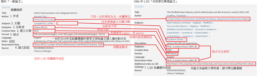 據台灣《中時電子報》報道,名為“biolenz”的網友日前交叉查證蔡英文倫敦政經學院(LSE)博士論文,經過比對該學院近40年的博士畢業論文,發現這些論文在圖書館細節字段 (Details) 部分有一個既定格式。如果仔細比對這些細節會發現“本校學位畢業論文”的記載方式與一般“他校學位畢業論文”及“一般論文”有所不同。