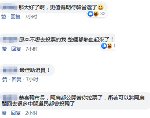 對此,有島內網友稱,“那太好了啊,更值得期待韓當選了”;“原本不想去投票的我,整個都熱血起來了!”還有網友説陳水扁是“最佳助選員”。