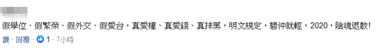也有網友也批評稱,“頭腦很清楚,比正常人還正常,蔡英文還假裝看不見”;至於民進黨,網友想到該黨近期的醜聞稱,“假學位、假繁榮、假‘外交’、假愛台,真愛權、真愛錢、真抹黑,明文規定,碧仲就輕,2020,陰魂退散!”