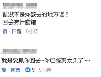 還有網友説,“監獄不是你該去的地方嗎?回去有什麼錯”,並表示“你已經爽太久了”。