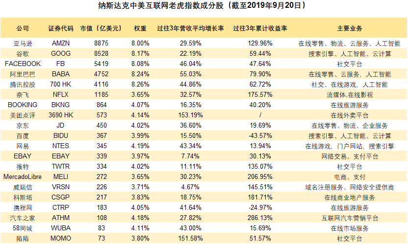 納斯達克中美互聯網老虎指數是納斯達克去年10月推出的追蹤中美互聯網巨頭股票走勢的主題指數。該指數追蹤中美市值最大的20家互聯網行業股票的表現,亞馬遜(AMZN)、谷歌(GOOG)、Facebook(FB),和中國的阿里巴巴(BABA)、騰訊(00700.HK)、百度(BIDU)等全球知名的互聯網巨頭均在成分股之列。