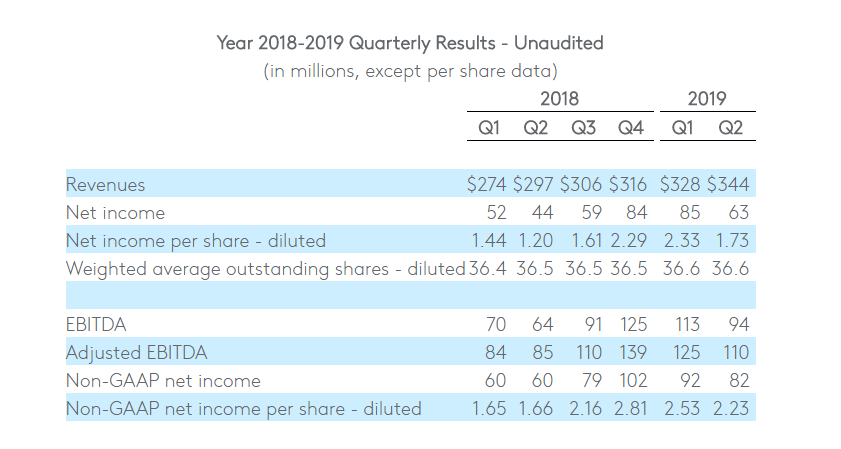 鑑於良好的發展勢頭,公司管理層上調2019年全年的業績指引:將全年收入指引中線上調1100萬美元,至13.82億美元-13.9億美元;還將調整後的EBITDA和調整後每股收益分別從原先的指導區間4.95億美元-5.05億美元、9.9美元-10.10美元提升至4.98億美元-5.05億美元和10美元-10.14美元。
