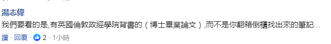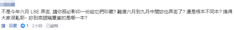還有人提到,蔡英文此前曾説過LSE今年六月曾弄丟她的論文,要複印一份給他們珍藏,“難道6月到9月中間你也弄丟了?還是根本不是同一本?搞得大家很亂耶。你到底號稱畢業的是哪一本?”