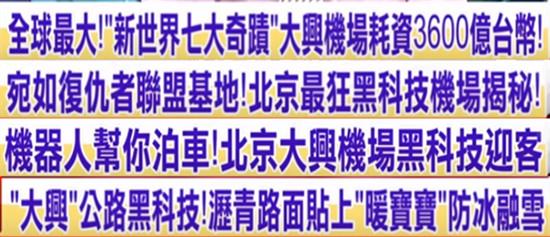 《這!不是新聞》是台灣東森財經新聞台晚間時段的時事新聞、財經談話性節目,在9月20日的一期節目中,主持人陳斐娟和人稱“股市憲哥”的台灣財經分析師賴憲政在提到北京大興國際機場時,詳細介紹了機場的建造規模、設計細節和科技功能,節目全程不住驚歎:“全世界超強的硬體!”“新世界的第七奇蹟!”