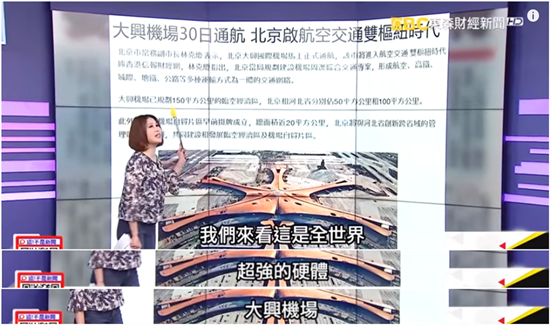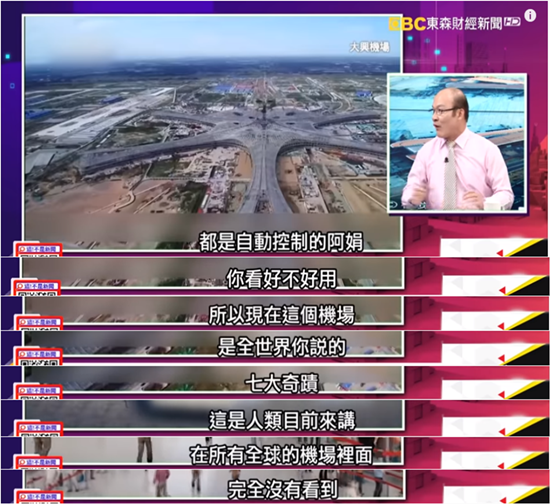 《這!不是新聞》是台灣東森財經新聞台晚間時段的時事新聞、財經談話性節目,在9月20日的一期節目中,主持人陳斐娟和人稱“股市憲哥”的台灣財經分析師賴憲政在提到北京大興國際機場時,詳細介紹了機場的建造規模、設計細節和科技功能,節目全程不住驚歎:“全世界超強的硬體!”“新世界的第七奇蹟!”