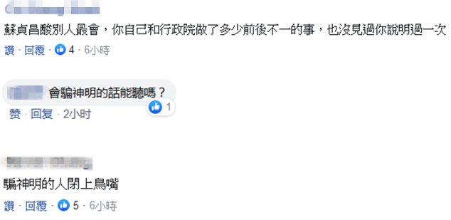 還有網友表示,“蘇貞昌酸別人最會,你自己和‘行政院’做了多少前後不一的事,也沒見過你説明過一次”;還有人讓他“閉嘴”,稱“騙神明的話能聽嗎?”