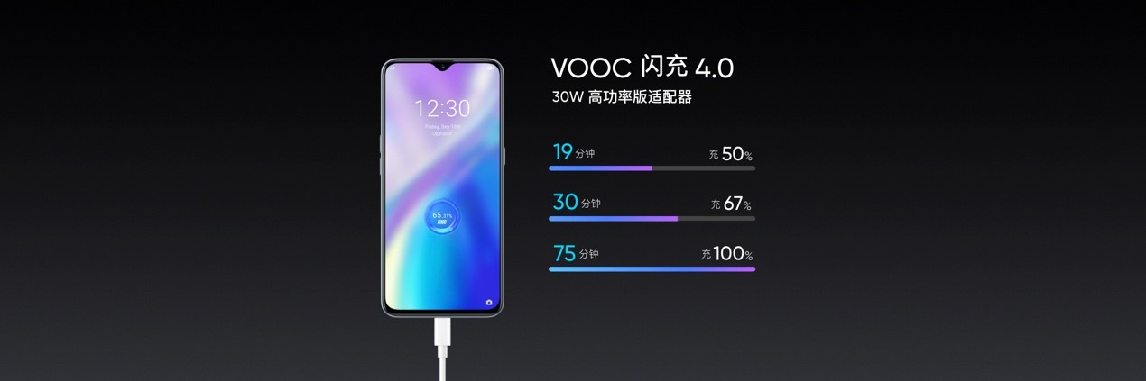 續航方面,realme X2配備4000mAh(典型值)大容量電池,支持AI凍庫技術,主動預測不常用應用,快速凍結,停止運行,並防止被調用或拉起,達到最大程度省電目的。同時,低壓大電流VOOC閃充 4.0,結合新一代恆壓算法,30W(5V6A)充電功率充電時間相比上一代縮短12%,支持亮屏充電、邊玩邊充。30分鐘就可以充至 67%。