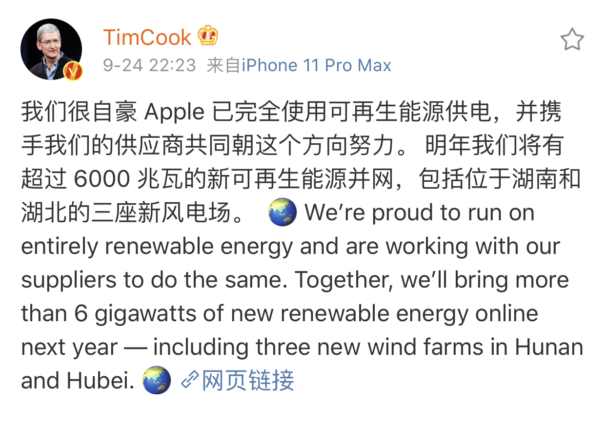 對此,Apple CEO庫克也發微博表示,“我們很自豪 Apple 已完全使用可再生能源供電,並攜手我們的供應商共同朝這個方向努力。 明年我們將有超過 6000 兆瓦的新可再生能源併網,包括位於湖南和湖北的三座新風電場。”
