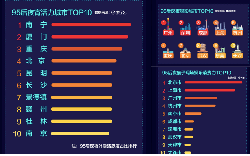 橫向比較95後宵夜活力城市TOP10、95後深夜觀影城市TOP10、95後夜貓子現場娛樂消費力TOP10,入圍城市均以南方城市為主。廣州、上海、杭州、成都、深圳四地95後夜貓子在多個文化消費榜單中處於領先位置,北京是唯一全部入圍的北方城市。