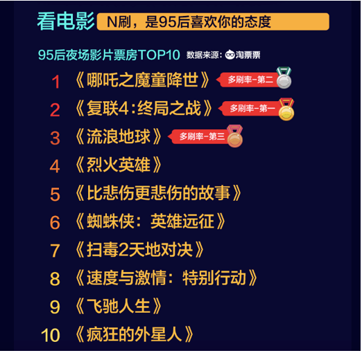 數據指出,超過35%的夜場電影用户為95後。95後年輕人對電影的偏好與票房分佈基本一致,直接影響票房大盤走勢。對於自己喜歡的優質電影,95後夜貓子傾向於用“多刷”的方式表達支持。淘票票數據顯示,2019年1月以來,95後“N刷”最多的影片依次是《復仇者聯盟4:終局之戰》《哪吒之魔童降世》《流浪地球》。