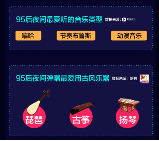 除此之外,音樂、閲讀也是95後夜貓子的心頭好。據蝦米數據顯示,嘻哈、節奏布魯斯和動漫是95後更為偏愛的音樂類型;來自廣東、浙江、江蘇、四川、山東的95後最愛深夜聽歌。年輕人不僅愛聽音樂,還找到了“玩”音樂的樂趣。在國內首款彈唱APP唱鴨上,年輕人在K歌時更熱衷於創造屬於自己的音樂,95後最喜歡用古風類樂器伴奏,尤其是琵琶、古箏、揚琴等傳統樂器受到年輕人追捧。