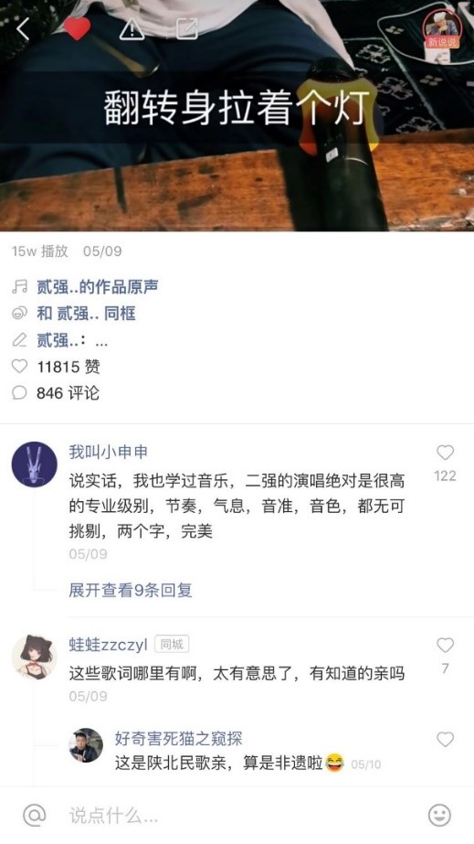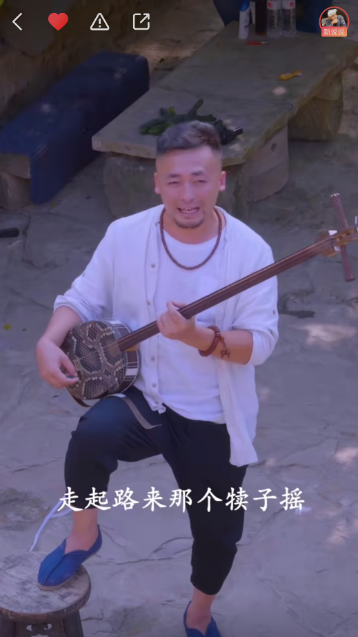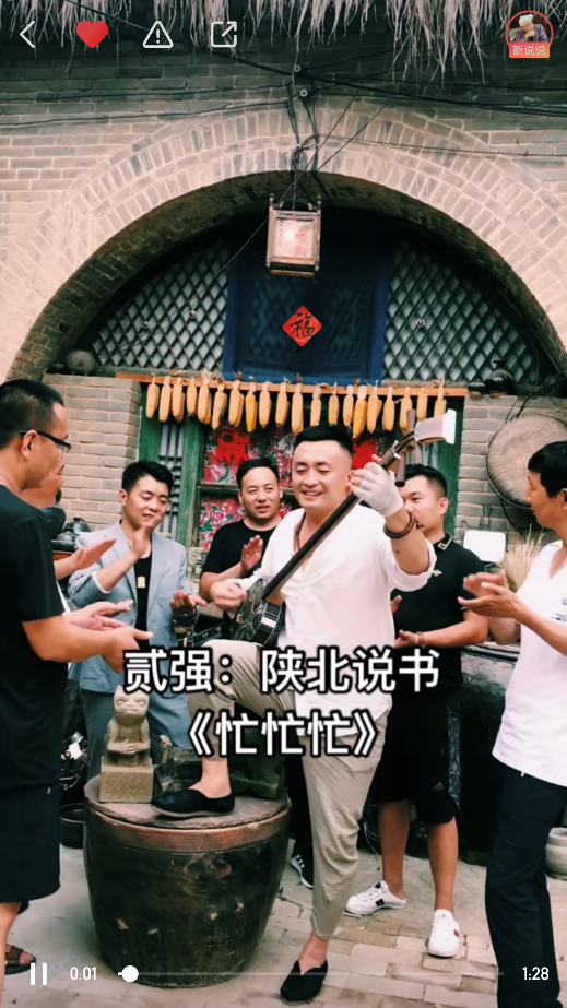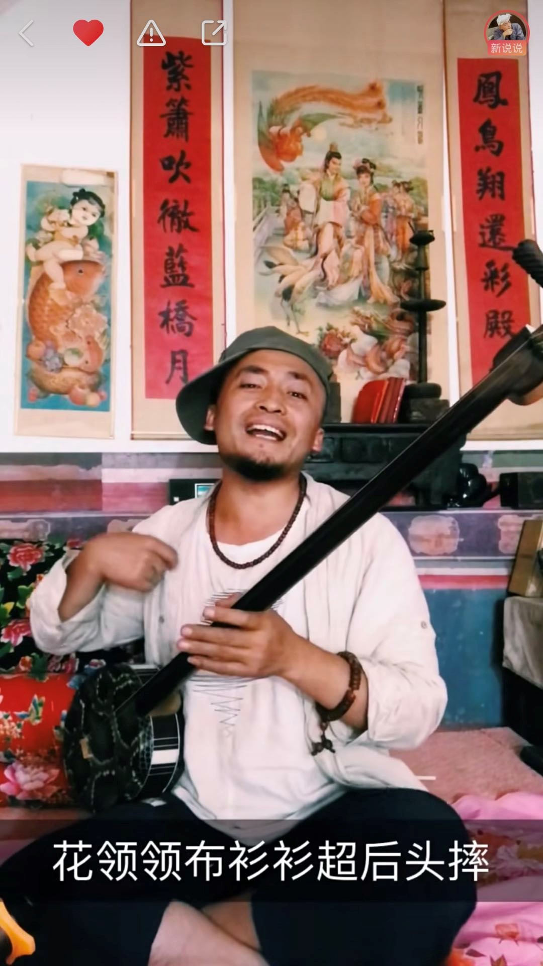 “這個陝北説書,我是越接觸越喜歡,極具陝北地域特色,將陝北文化濃縮於演唱形式,我想讓更多人瞭解陝北説書,也一同瞭解陝北方言、陝北文化。”他在快手中亦是如此,常抱着音色粗獷的三絃,用辨識度極高的陝北唱腔演繹陝北説書。