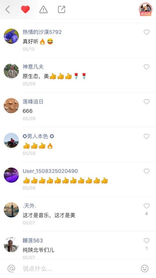 從初期的幾百播放量,到如今的上萬、上百萬播放量,收穫粉絲與爆光的背後,更讓林正強興奮的是文化形式的傳遞:“陝北説書在我心中一直是小眾文化,認為其他地域的人很難喜歡,但通過快手的傳播侯,更多天南地北的朋友開始喜歡陝北説書。”視頻下方,有老鐵幽默地表達了愛上陝北説書的心路歷程:“第一次聽:‘這是啥?一句也聽不懂。’第二次聽:‘有點意思,這韻律和腔調聽着還挺舒服。’第三次聽:‘舒坦!我要循環播放!’”