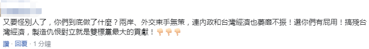 而此次台“國安會”把台當局連丟2個“邦交國”説成是“大陸無所不用其極介入台灣2020選舉”之後,島內網友對這一論調展開各種諷刺解讀:有人直言民進黨當局又要怪別人了,“你們到底做了什麼”“選你們有屁用”“製造仇恨對立就是雙標黨最大的貢獻”