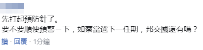 還有人調侃,台“國安會”是在打預防針。“要不要順便預警一下,如果蔡當選下一任期,邦交國還有嗎?”