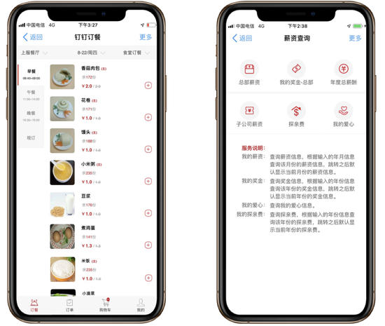 薪資查詢:沒有釘釘平台之前,工資發放後,大量員工到辦公室諮詢薪資問題,溝通、解釋工作量大,且體驗感差。現在月度工資、年終獎、探親費、年度總薪酬等全部在釘釘查詢,方便快捷,員工滿意度提高。