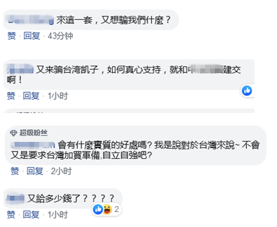網友説,“來這一套,又想騙我們什麼?”“又來騙台灣凱子,如果真心支持,就和台灣‘建交’”。還有網友想到了美國的對台軍售,稱“會有什麼實質的好處嗎?我是説對於台灣來説~ 不會又是要求台灣加買軍備,自立自強吧?”↓