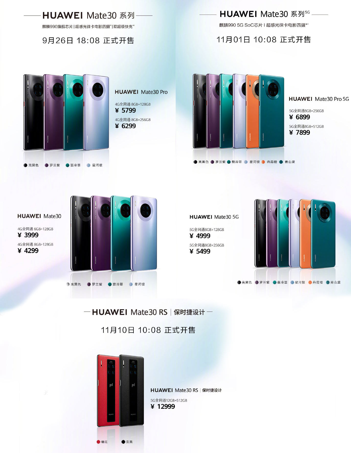 4G版Mate30和Mate30 Pro將於9月26日18:26開售;5G版Mate30和Mate30 Pro將於11月1日10:08開售;Mate30 RS保時捷設計將於11月10日10:08開售。