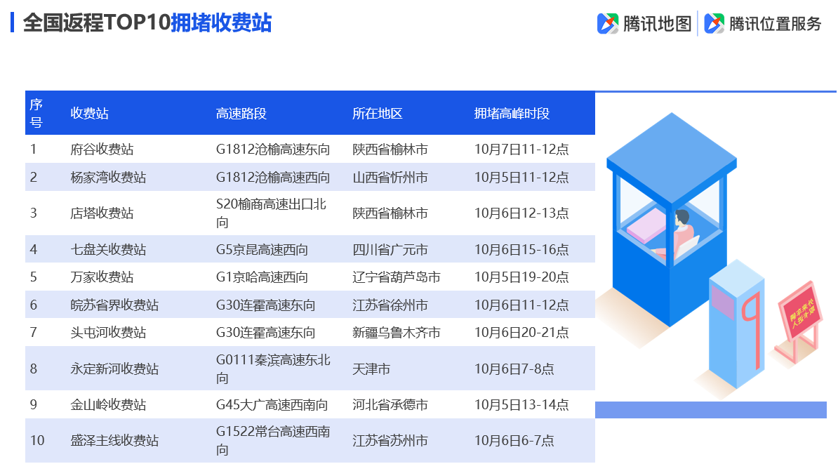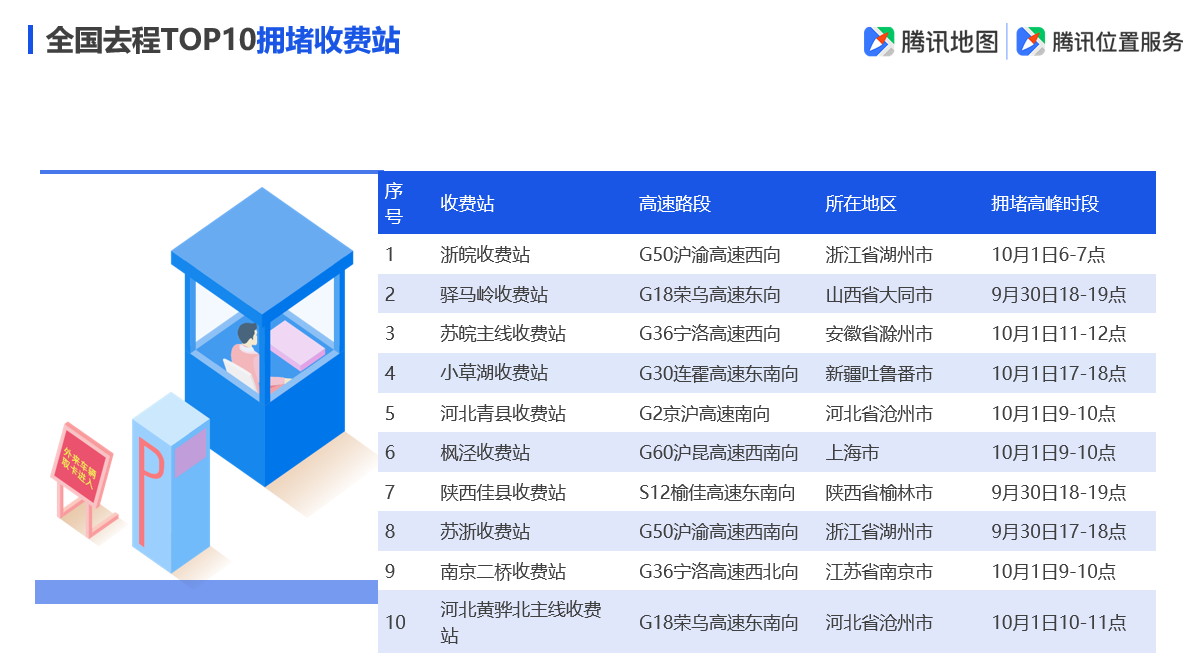 省界收費站作為跨省高速必經之地,是最有可能出現“大型露天停車場”的路段,預計未來省界收費站的取消,能在很大程度上緩解此類擁堵。根據十一出行大數據報告,假期伊始位於浙江省湖州市的浙皖收費站將成為全國第一堵;返程階段最堵收費站為陝西榆林的府谷收費站。