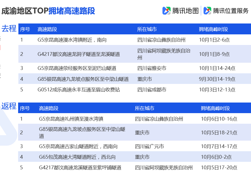 成渝地區,重慶進出城壓力最大,此外涼山彝族自治州、阿壩藏族羌族自治州的擁堵狀況也非常嚴重。時間上看,成渝地區去程和返程擁堵時間戰線較長,去程從9月30日持續到10月3日,返程擁堵從10月5日持續到7日。