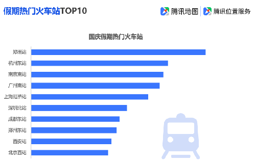 鐵路運輸方面,鄭州站作為溝通東西、連接南北的中部交通要塞,首當其中成為此次黃金週最忙碌的火車站;其次是杭州東站,它是接軌上海、連接蘇南、輻射浙江各地的中心節點,更是亞洲最大鐵路樞紐;緊隨其後的有南京南站、廣州南站、上海虹橋站等,北京西站僅列假期熱門火車站前十中的最末位。從客流時間趨勢上來看,10月1日和7日的去返程客流量大於假期中間(2日-6日);去程客流高峯集中在12點-14點,返程客流高峯集中在16點-17點。