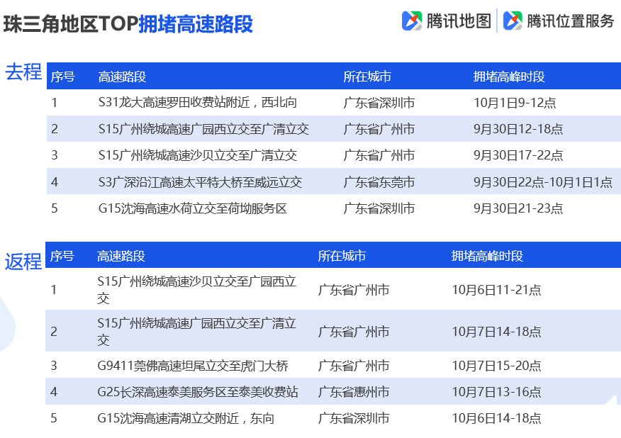 珠三角地區的擁堵更為集中,去程和返程最擁堵的十大收費站中,廣州佔得五席,深圳佔得三席,另有東莞、惠州位列其中;從時間上看,珠三角的去程擁堵較其他區域提前至9月30日中午,返程擁堵出現在10月6日和7日下午。