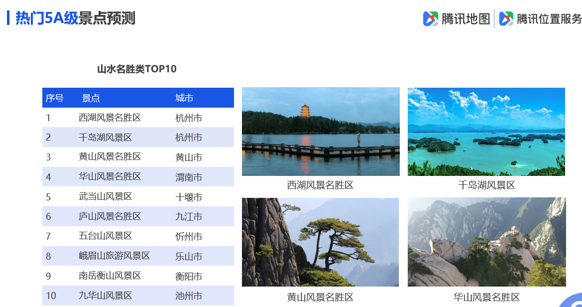騰訊地圖通過大數據分析,篩選出十大相對冷門的5A景點,全部位於南方各省市,不失為度假放鬆的絕佳去處。分別是:巫山小三峽、福建土樓景區、黃龍風景區、連州地下河風景區、分界洲島風景區、呀諾達雨林文化旅遊區、橫店明清民居博覽城、九寨溝風景區、石林風景區、大足石刻世界遺產博覽園等。
