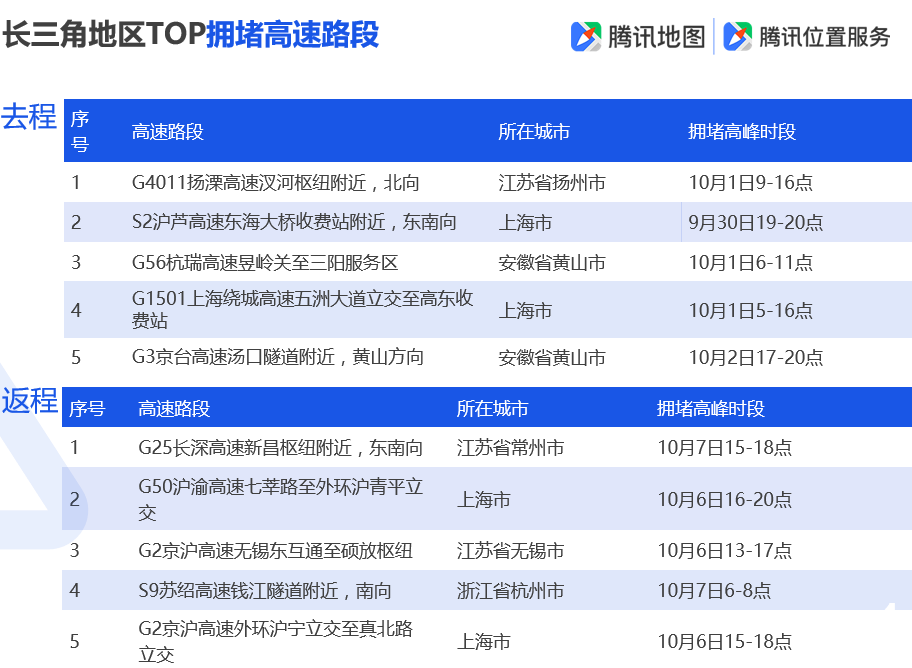 長三角區域除了上海承擔了最大交通運輸壓力之外,安徽黃山受遊客人潮影響周邊高速公路也將出現強度較大的擁堵;高速樞紐、收費站、服務區等功能性路段更易發生擁堵;從時間上看,9月30日-10月2日是去程高峯,10月1日當天部分路段可能出現全天擁堵,10月6日-7日是返程高峯,且13-20點最易發生擁堵。