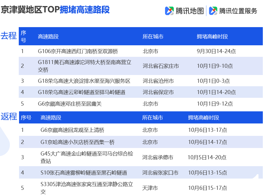 全國主要城市當中,京津冀地區北京仍是“首堵”擔當,在去程和返程TOP擁堵路段中十席獨佔四席;最擁堵高速路段主要處於進出北京方向;從時間上看,9月30日和10月1日是去程高峯,且9-12點、14-24點兩個時間段最易發生擁堵,10月5日-6日是返程高峯,且13-17點最易發生擁堵。
