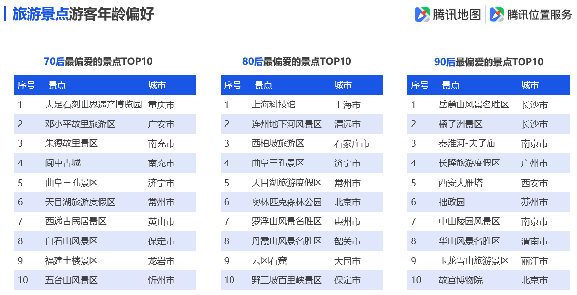十一出行大數據報告分析,鄧小平故里、朱德故里、曲阜三孔景區分列最受70後偏愛景點的第2、3、5位,80後、90後們恐怕無法理解70後們對名人故居的這種執念;而在80後偏愛的景點中,既有上海科技館這樣的科教景點,也有西柏坡旅遊區這樣的紅色基地,同樣也有曲阜三孔景區,是不是可以大膽的猜測80後們都在帶娃出行?真可謂遊玩教育兩不誤;相對來説90後們就自由多了,既可以去長隆旅遊度假區挑戰自我,也能前往玉龍雪山征服高山高寒,還可以去西安大雁塔欣賞名勝古蹟。