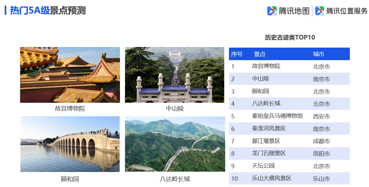 也許是對即將過去的夏天還戀戀不捨,黃金週期間大部分人都湧向了南方各景區,無論是欣賞山水名勝,還是遊覽古城古鎮,或是前往各大樂園縱情揮灑汗水,熱門5A級景點TOP10幾乎被南方景點包攬。北方城市僅在最受歡迎的歷史古蹟類景點預測中扳回一局。其中,北京以故宮、頤和園、八達嶺長城、天壇公園佔得了四個席位。