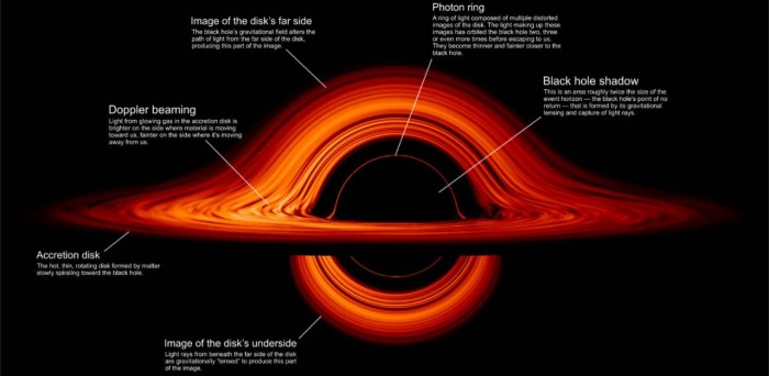 據NASA稱,盤上似乎勾勒出黑洞的部分實際上是環的底面。這也是由於黑洞的引力引起的極端彎曲。從任何角度觀看時,外觀看起來都是相同的。