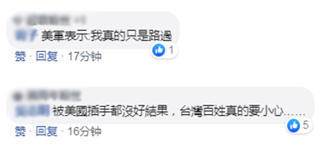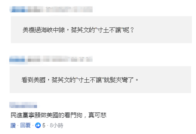 對此,有島內網民怒問,美機過"海峽中線"時,蔡英文的"寸土不讓"呢?看到美國,蔡英文的"寸土不讓"就"髮夾彎"了;還有網友怒罵,民進黨寧願做美國的看門狗,真可悲。↓