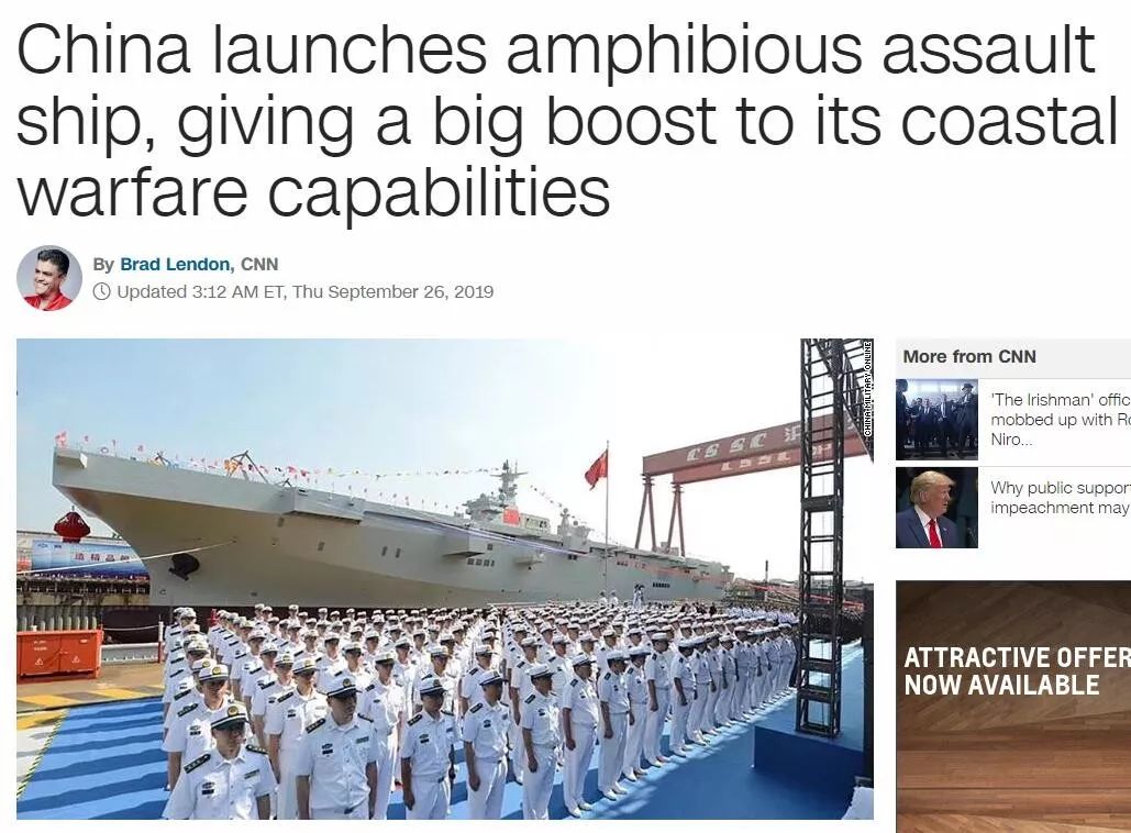 CNN在文章中稱,據美國國防部在5月發佈的國會年度報告中指出,中國已經是世界上最大的造船國。中國一直在生產先進的驅逐艦和潛艇,它有一艘目前在海上試航狀態的國產航母,還有一艘正在建造中的航母。美國報告還指出,中國正在提高和完善兩棲作戰能力,並擴充海軍陸戰隊。