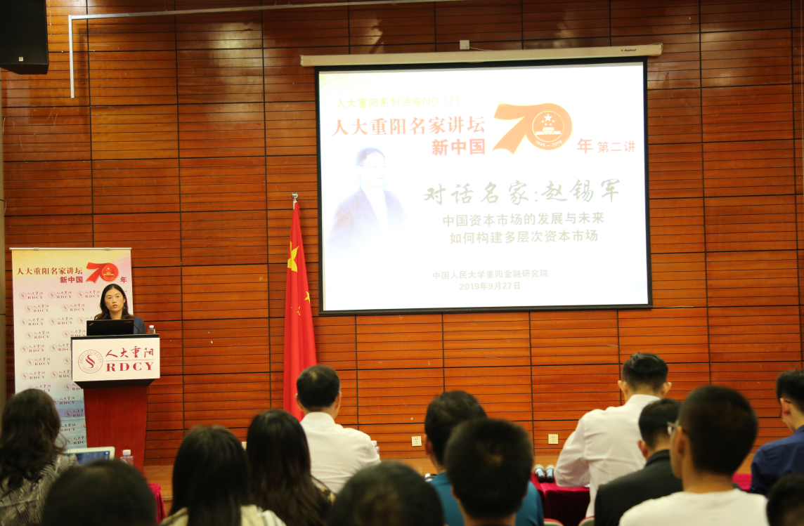 9月27日,中國人民大學重陽金融研究院(人大重陽)與環球網合作舉辦的“人大重陽名家講壇之新中國70年”系列講座第二講在中國人民大學舉行。中國人民大學財政金融學院副院長、教授、博士生導師,國務院政府特殊津貼獲得者趙錫軍發表題為“中國資本市場的發展與未來:如何構建多層次資本市場”的主題演講,現場200多位來賓聆聽了講座。本次講座由人大重陽研究員劉英主持。