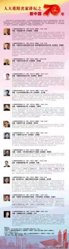 “人大重陽名家講壇之新中國70年”系列講座共13講,邀請了中國人民大學多位權威學者,梳理新中國的發展歷程與歷史變革,剖析輝煌成就背後的內在邏輯,展望未來發展之路。本次講座之後,還將陸續舉辦“金燦榮:中國對外關係70年”“翟東昇:中國和世界經濟70年”“王義桅:從大歷史看新中國七十年”“許勤華:中國能源安全70年”“周洛華:新中國貨幣70年”“莊毓敏:中國銀行業70年”“賈晉京:大創新 70年來的中國生產力發展”“李勇:中國財富管理70年”“劉守英:新中國70年 理解中國的歷史轉型”“汪昌雲:中國資產定價的理論與實踐 70年的視角”“王文:中國智庫70年”等11場講座。