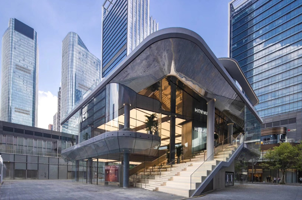 華為全球旗艦店為三層的獨棟建築,以“城市廣場”為設計理念,將中國傳統的“天圓地方”建築哲學與西方簡約現代的設計理念融合在一起,外立面採用了大面積高透玻璃,邊角採用圓弧設計,宛如一個精緻的玻璃樽。