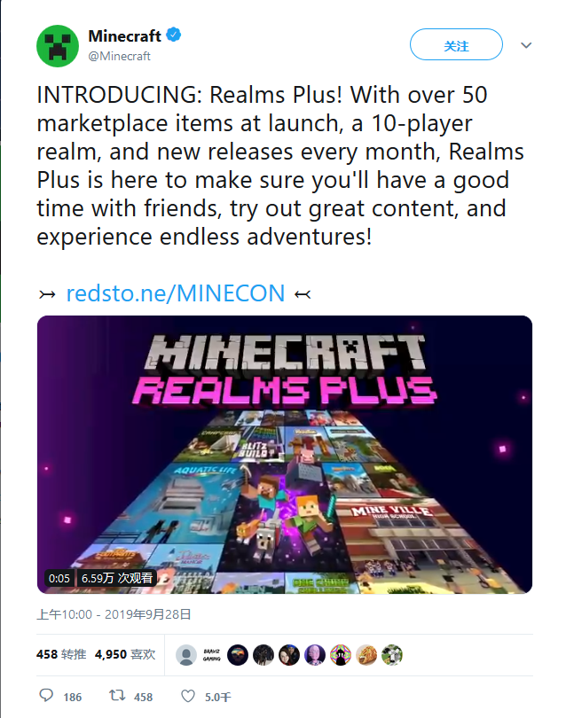 在今年的Minecon活動中,公司還宣佈了新的Realms Plus訂閲。根據Realms計劃經理Fedrick Telenius表示,該訂閲的價格和當前最多可容納10位玩家的價格(7.99美元)相同,但將“添加五十多個內容”,包括皮膚,紋理和世界。Mojang將為之前未訂閲Realms的用户提供免費試用,而當前10位玩家的訂閲將會自動升級。