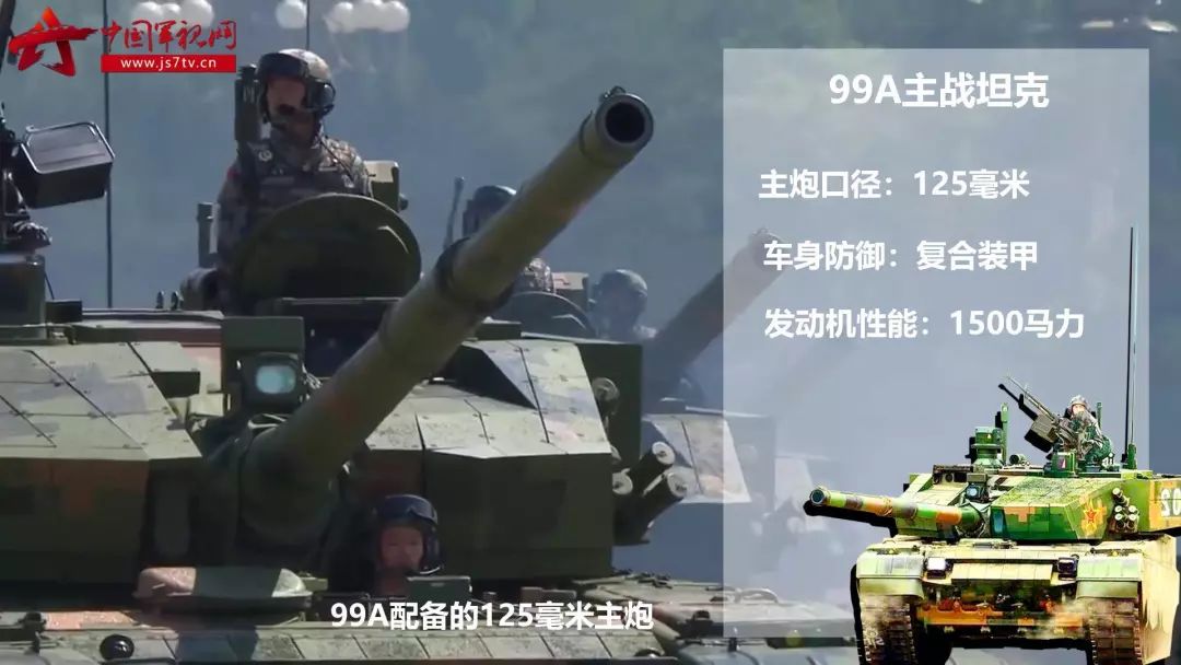 99A配備的125毫米主炮不但威力強大、精度高,而且兼容多個彈種,可毀傷具有不同特性的目標。在被動防護方面,99A不但在車體周圍加裝先進的複合裝甲,而且頂部也披上新型複合裝甲,能全方位抵擋來自敵方坦克、反坦克導彈以及武裝直升機的火力打擊。
