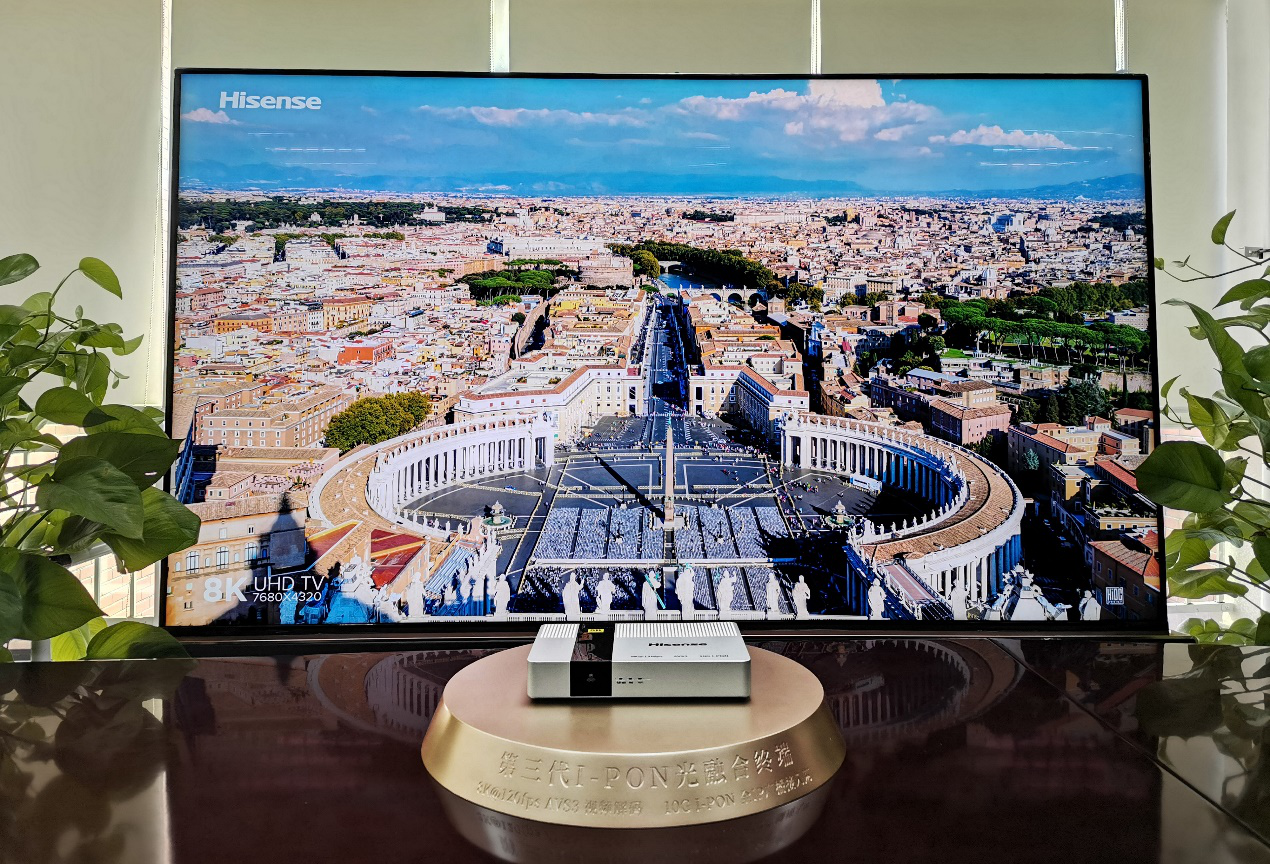 據介紹,海信寬帶第三代8K+I-PON光融合一體機產品內部通過千兆網絡與8K解碼芯片相連,千兆帶寬的網絡通道可傳輸採用HEVC技術壓縮後的節目源(正常傳輸僅需200M~300M帶寬),實現8K節目的解碼和傳輸。